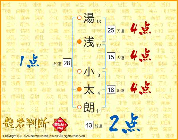 湯(13画)浅(12画) 小(3画)太(4画)朗(11画)