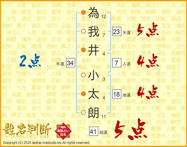 為(12画)我(7画)井(4画) 小(3画)太(4画)朗(11画)