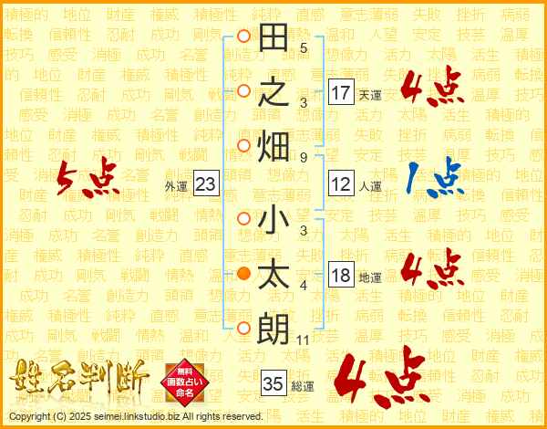 田(5画)之(3画)畑(9画) 小(3画)太(4画)朗(11画)