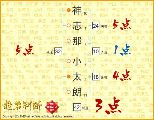 神(10画)志(7画)那(7画) 小(3画)太(4画)朗(11画)