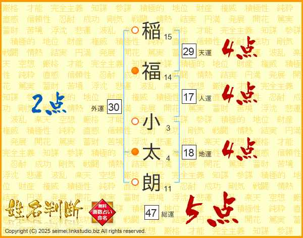 稲(15画)福(14画) 小(3画)太(4画)朗(11画)
