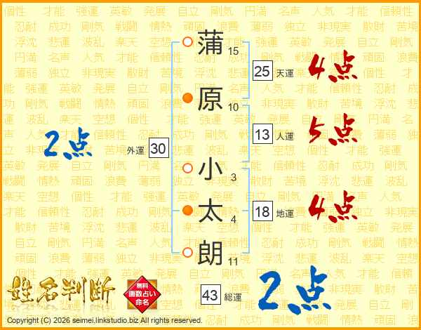 蒲(15画)原(10画) 小(3画)太(4画)朗(11画)