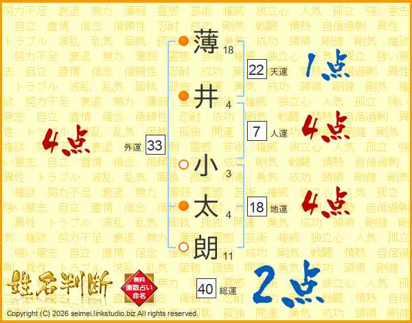 薄(18画)井(4画) 小(3画)太(4画)朗(11画)