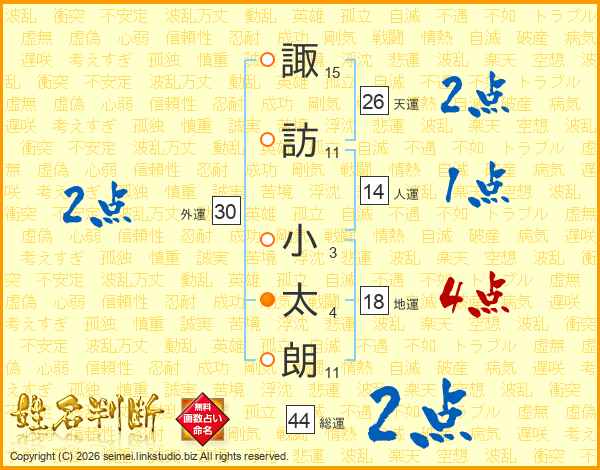 諏(15画)訪(11画) 小(3画)太(4画)朗(11画)
