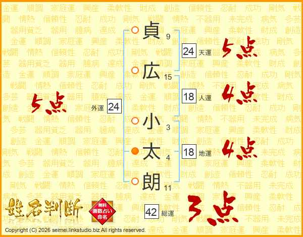 貞(9画)広(15画) 小(3画)太(4画)朗(11画)