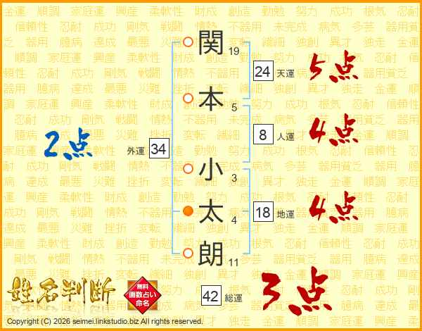 関(19画)本(5画) 小(3画)太(4画)朗(11画)