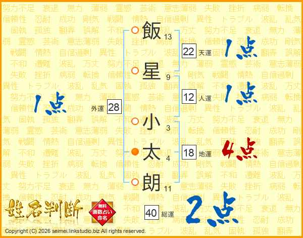 飯(13画)星(9画) 小(3画)太(4画)朗(11画)
