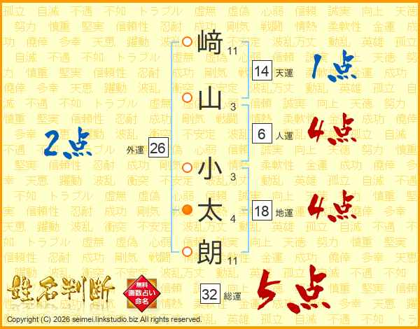 﨑(11画)山(3画) 小(3画)太(4画)朗(11画)