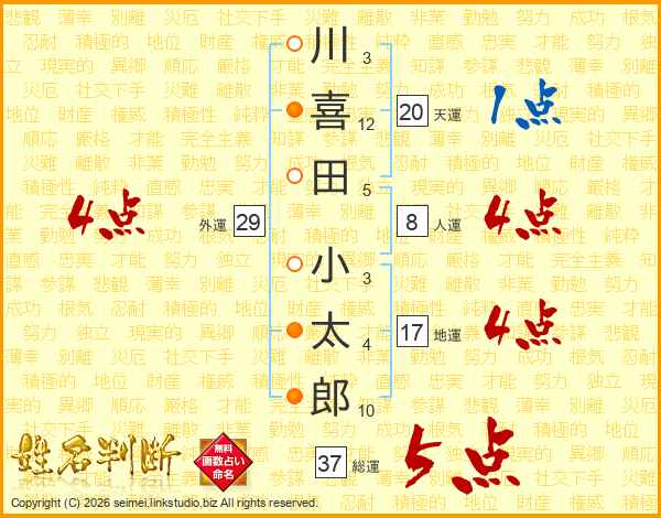 川(3画)喜(12画)田(5画) 小(3画)太(4画)郎(10画)