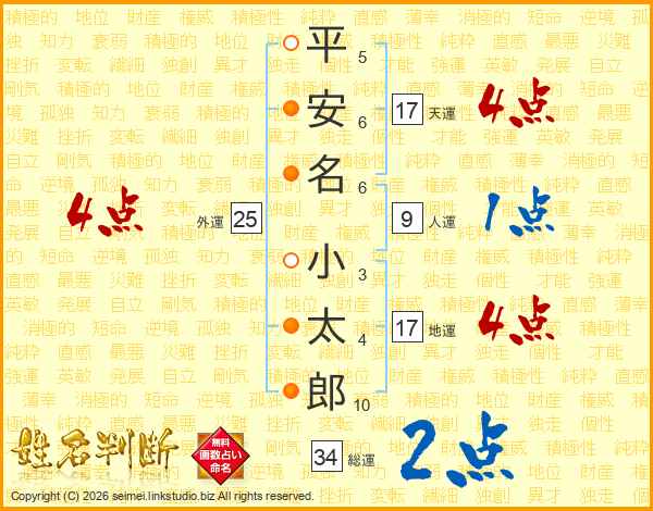 平(5画)安(6画)名(6画) 小(3画)太(4画)郎(10画)