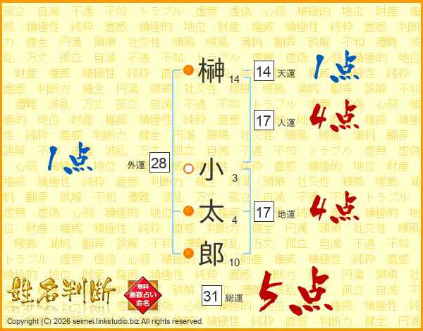 生活面を象徴する運勢です。外部から受ける影響力を表し、結婚運、家庭運や職場、環境への順応性を表します。総運から人運を引いた画数。姓や名が1文字の場合を除く。