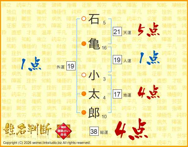 石(5画)亀(16画) 小(3画)太(4画)郎(10画)