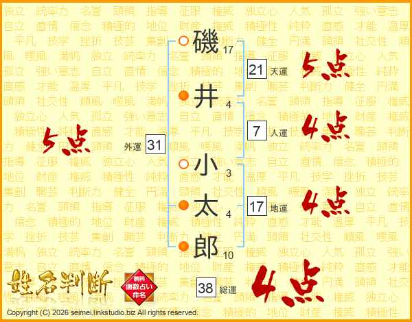 磯井小太郎さんの総運は38画の4点!