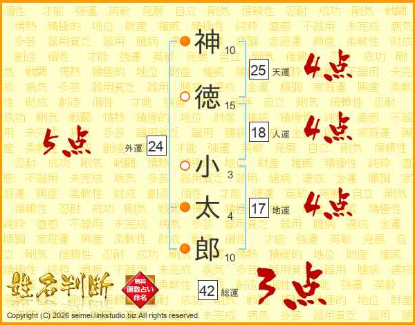 神(10画)徳(15画) 小(3画)太(4画)郎(10画)