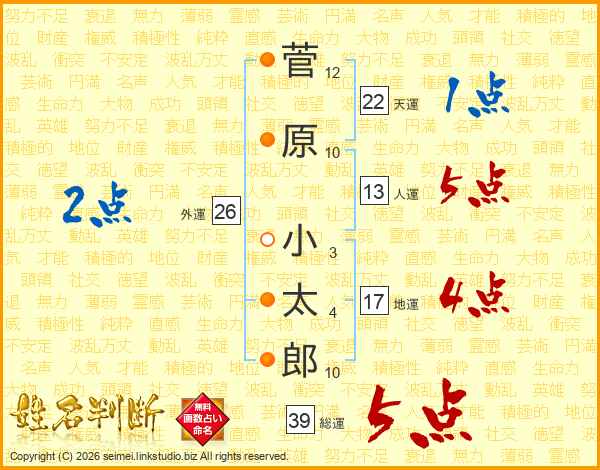 菅(12画)原(10画) 小(3画)太(4画)郎(10画)