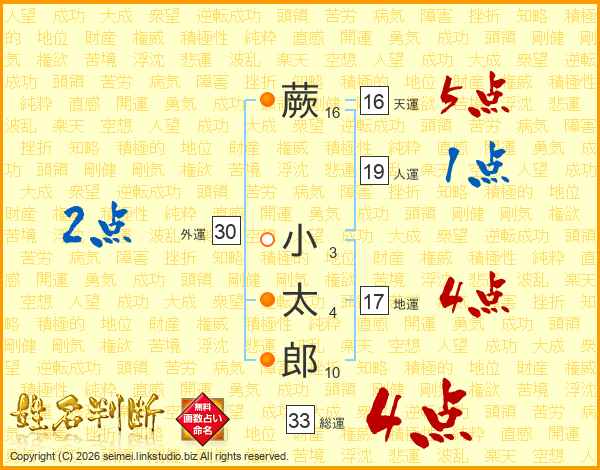 蕨小太郎さんの総運は33画の4点!