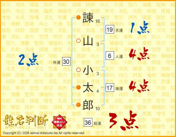 諫(16画)山(3画) 小(3画)太(4画)郎(10画)