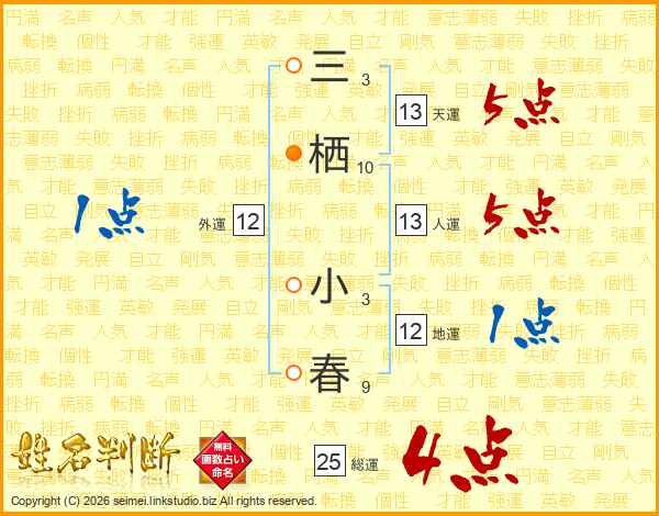 生活面を象徴する運勢です。外部から受ける影響力を表し、結婚運、家庭運や職場、環境への順応性を表します。総運から人運を引いた画数。姓や名が1文字の場合を除く。