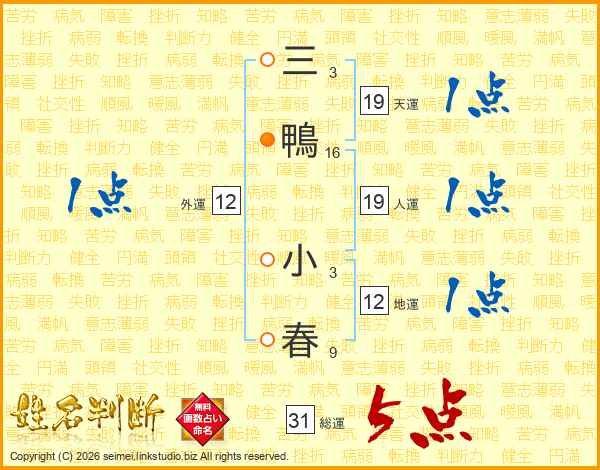 生活面を象徴する運勢です。外部から受ける影響力を表し、結婚運、家庭運や職場、環境への順応性を表します。総運から人運を引いた画数。姓や名が1文字の場合を除く。