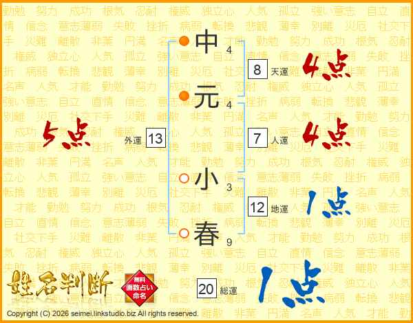 生活面を象徴する運勢です。外部から受ける影響力を表し、結婚運、家庭運や職場、環境への順応性を表します。総運から人運を引いた画数。姓や名が1文字の場合を除く。