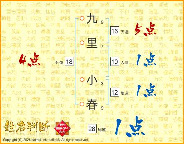 生活面を象徴する運勢です。外部から受ける影響力を表し、結婚運、家庭運や職場、環境への順応性を表します。総運から人運を引いた画数。姓や名が1文字の場合を除く。