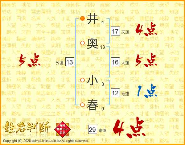 井(4画)奥(13画) 小(3画)春(9画)