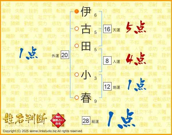 伊(6画)古(5画)田(5画) 小(3画)春(9画)