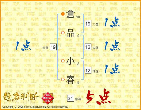 生活面を象徴する運勢です。外部から受ける影響力を表し、結婚運、家庭運や職場、環境への順応性を表します。総運から人運を引いた画数。姓や名が1文字の場合を除く。