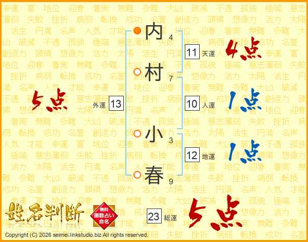 生活面を象徴する運勢です。外部から受ける影響力を表し、結婚運、家庭運や職場、環境への順応性を表します。総運から人運を引いた画数。姓や名が1文字の場合を除く。