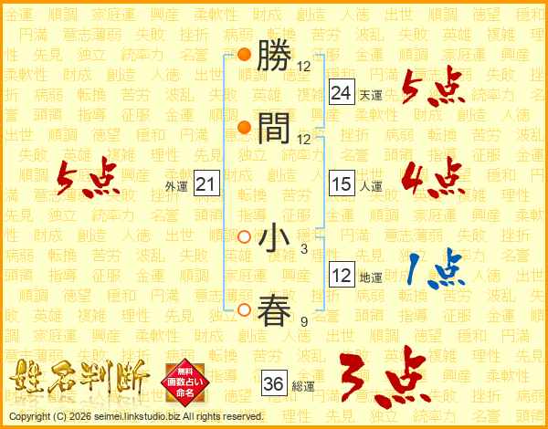 勝(12画)間(12画) 小(3画)春(9画)
