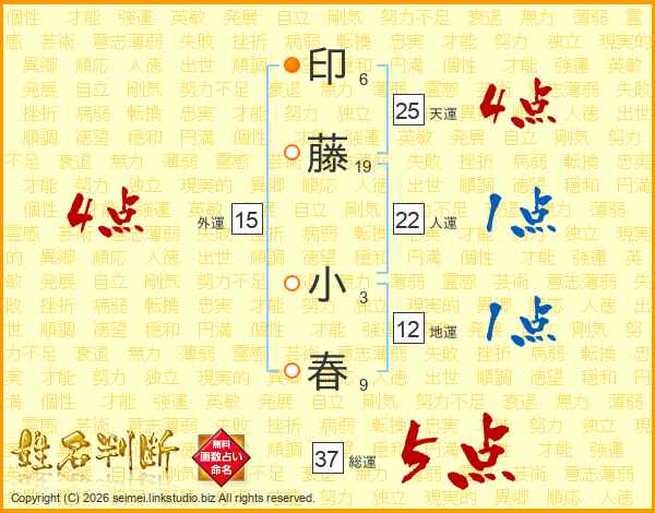 印藤小春さんの総運は37画の5点!