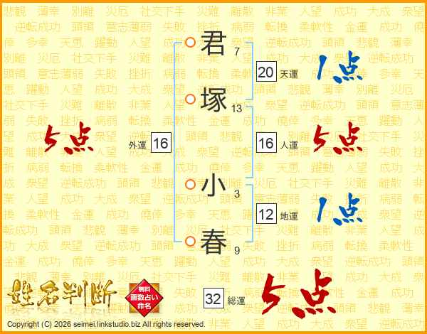 君塚小春さんの総運は32画の5点!