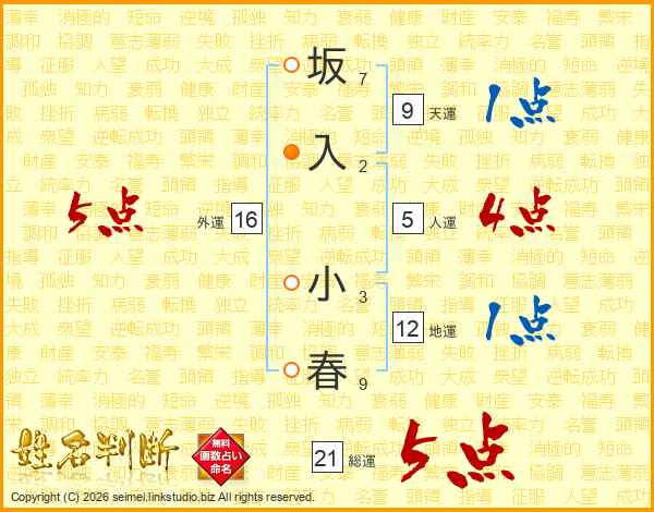 生活面を象徴する運勢です。外部から受ける影響力を表し、結婚運、家庭運や職場、環境への順応性を表します。総運から人運を引いた画数。姓や名が1文字の場合を除く。