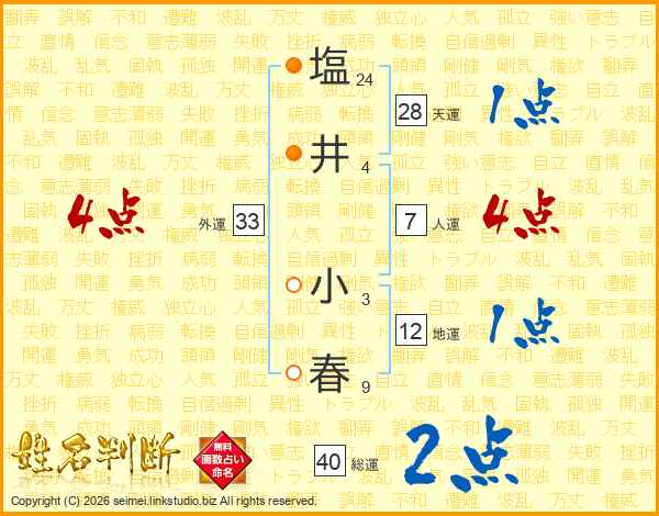 生活面を象徴する運勢です。外部から受ける影響力を表し、結婚運、家庭運や職場、環境への順応性を表します。総運から人運を引いた画数。姓や名が1文字の場合を除く。