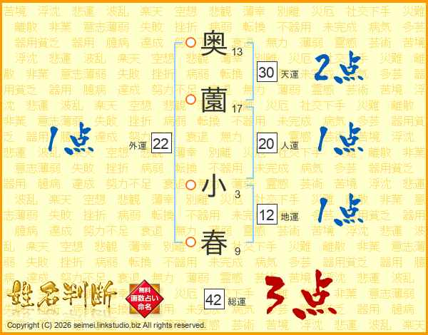 奥(13画)薗(17画) 小(3画)春(9画)