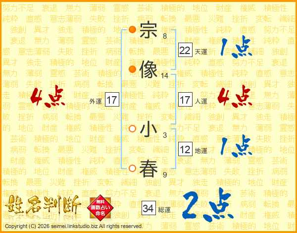 生活面を象徴する運勢です。外部から受ける影響力を表し、結婚運、家庭運や職場、環境への順応性を表します。総運から人運を引いた画数。姓や名が1文字の場合を除く。