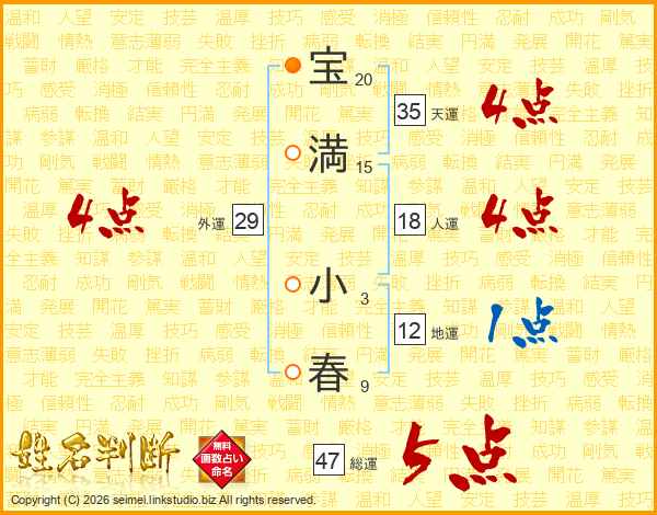 生活面を象徴する運勢です。外部から受ける影響力を表し、結婚運、家庭運や職場、環境への順応性を表します。総運から人運を引いた画数。姓や名が1文字の場合を除く。