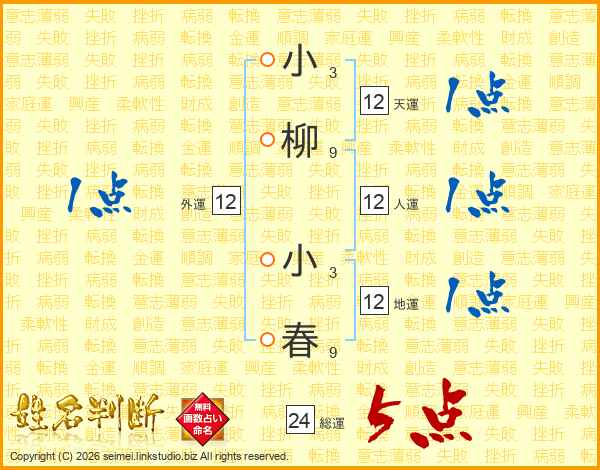 生活面を象徴する運勢です。外部から受ける影響力を表し、結婚運、家庭運や職場、環境への順応性を表します。総運から人運を引いた画数。姓や名が1文字の場合を除く。