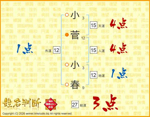 生活面を象徴する運勢です。外部から受ける影響力を表し、結婚運、家庭運や職場、環境への順応性を表します。総運から人運を引いた画数。姓や名が1文字の場合を除く。