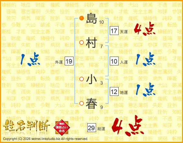 島村小春さんの総運は29画の4点!