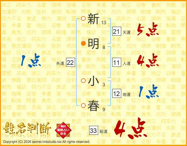 生活面を象徴する運勢です。外部から受ける影響力を表し、結婚運、家庭運や職場、環境への順応性を表します。総運から人運を引いた画数。姓や名が1文字の場合を除く。