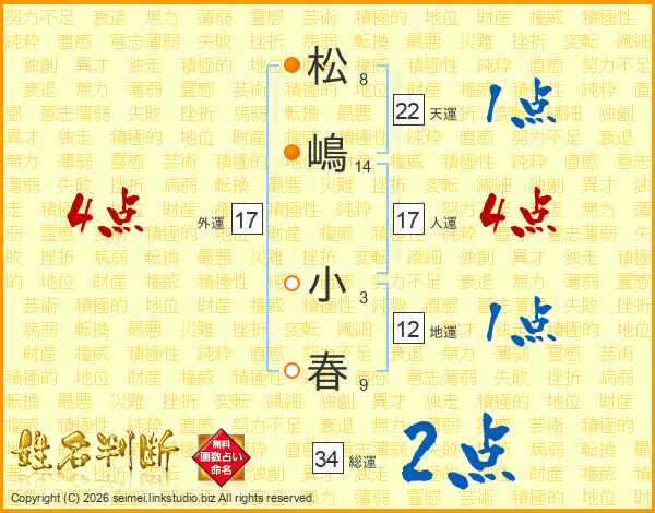 松(8画)嶋(14画) 小(3画)春(9画)