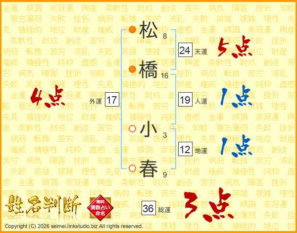 松(8画)橋(16画) 小(3画)春(9画)