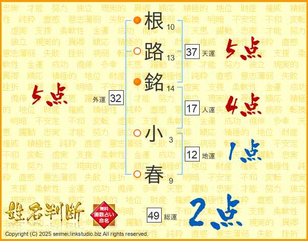 根(10画)路(13画)銘(14画) 小(3画)春(9画)