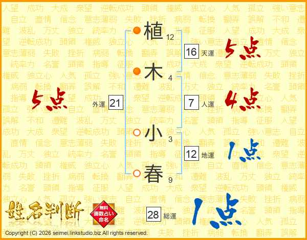 植(12画)木(4画) 小(3画)春(9画)