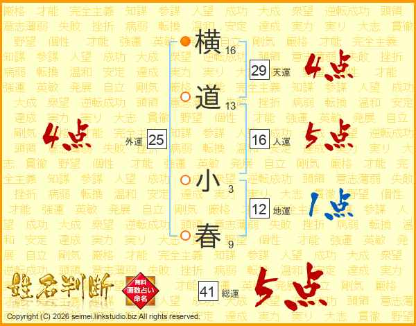 横道小春さんの総運は41画の5点!