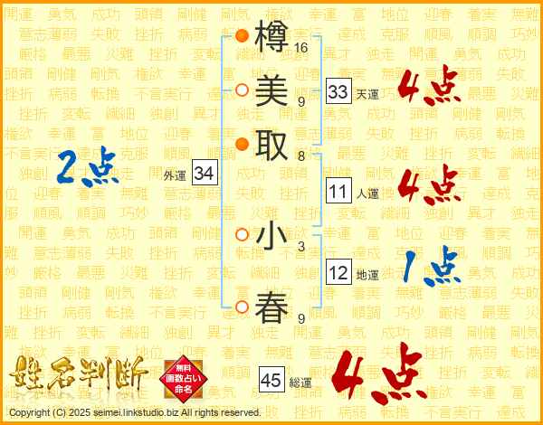 樽美取小春さんの総運は45画の4点!