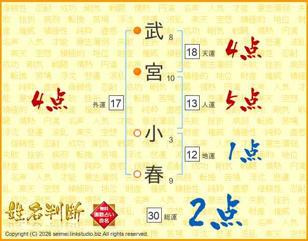 武(8画)宮(10画) 小(3画)春(9画)