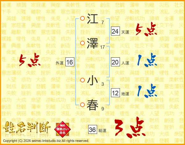 生活面を象徴する運勢です。外部から受ける影響力を表し、結婚運、家庭運や職場、環境への順応性を表します。総運から人運を引いた画数。姓や名が1文字の場合を除く。