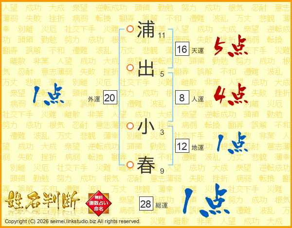 生活面を象徴する運勢です。外部から受ける影響力を表し、結婚運、家庭運や職場、環境への順応性を表します。総運から人運を引いた画数。姓や名が1文字の場合を除く。